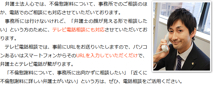 トップその他電話相談・テレビ電話相談について 階層構造▼ その他(目次) 電話相談・テレビ電話相談について その他(目次)その他トップ共通バナー元※削除不可心グループニュース(新着情報)弁護士・スタッフ選ばれる理由お役立ち情報・Q&Aお役立ち情報不倫の慰謝料請求の時効不倫慰謝料の請求額はどのようにして決めるかQ&A不倫慰謝料の求償権に関するQ&A電話相談・テレビ電話相談について代表メッセージプライバシーポリシー 受付時間 平日 9時~21時、土日祝 9時~18時 夜間・土日祝の相談も対応します (要予約) 所在地 〒120-0034 東京都足立区千住2-4オカバツインタワービル イースト5F 0120-41-2403 お問合せ・アクセス・地図